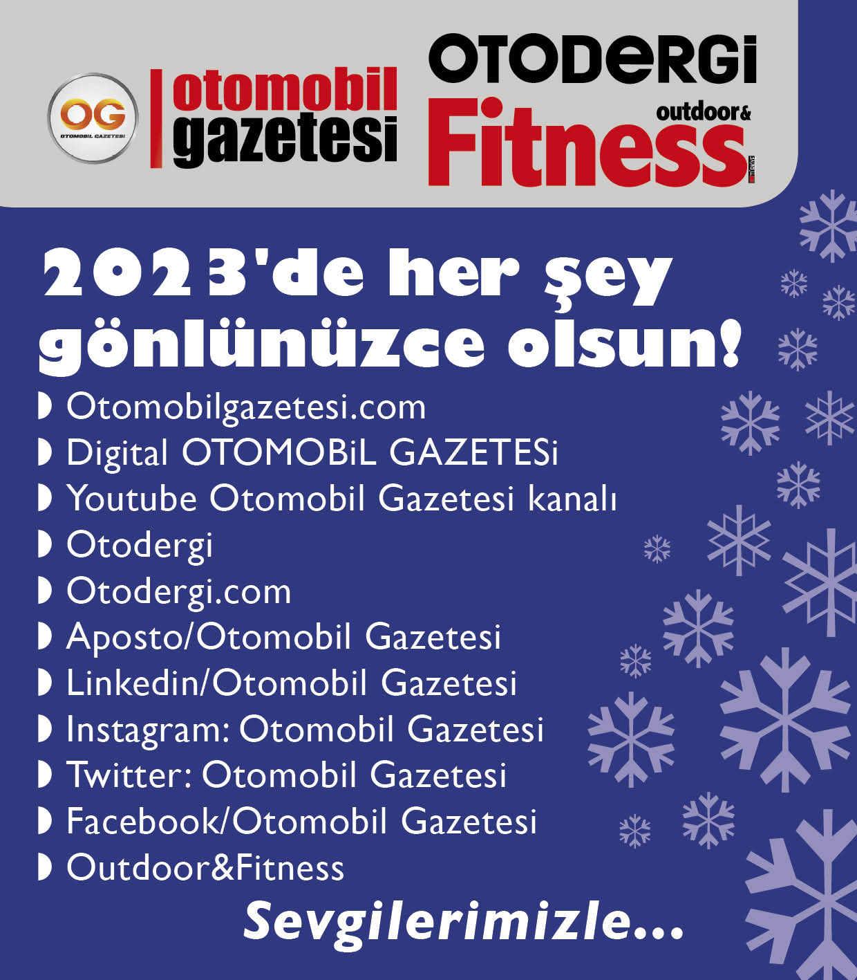 Hoşgeldin 2023... Yeni yılınız kutlu olsun... 2159 OKUNMA 31-12-2022 18:32 Güncelleme : 31-12-2022 18:33 #2023 # yılbaşı # yeni yıl # YORUMLAR Website Disqus Adınız * E-Posta Adresiniz * Yorumunuz * Haberler Toyota, hibrit segmentinde de lider olmaya devam etti. 10 binek aracın 4’ünün elektrikli olmasını hedefliyoruz! Büyüme devam edecek her yıl rekor kırılacak!.. 2026’da otomotiv gazeteciliğinin yok olan itibarı geri gelir mi? Yerli SWM G01 Pro Ocak’ta satışa çıkıyor!.. Çok Okunanlar 1 Hyundai’nin sürpriz yeni elektrikli modeli, Brüksel Otomobil Fuarı’nda 2 10 binek aracın 4’ünün elektrikli olmasını hedefliyoruz! 3 Fiat Grande Panda'nın hibrit versiyonu Türkiye'de satışta 4 "2026'da otomotiv pazarı bu yılın altında kalabilir" 5 2026’da otomotiv gazeteciliğinin yok olan itibarı geri gelir mi?
