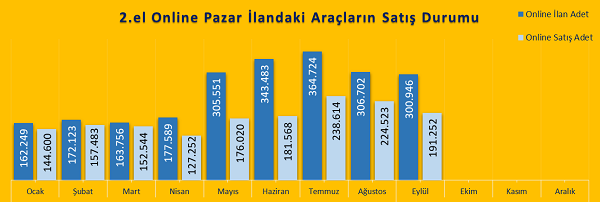 Satışlarda geçen senenin aynı dönemine göre %38 artış, geçen aya göre %15 oranında bir düşüş gözlenmiştir. 2020 yılı ilk dokuz aylık dönemde ise (Ocak-Eylül 2020); ikinci el online binek ve hafif ticari araç pazarında 1.593.856 adet satış gerçekleşmiştir. Bu adetle satışlar geçen senenin aynı dönemine göre %26 artmıştır. Geçen sene aynı dönemde 1.268.200 adet satış gerçekleşmişti. (Ocak-Eylül 2019)